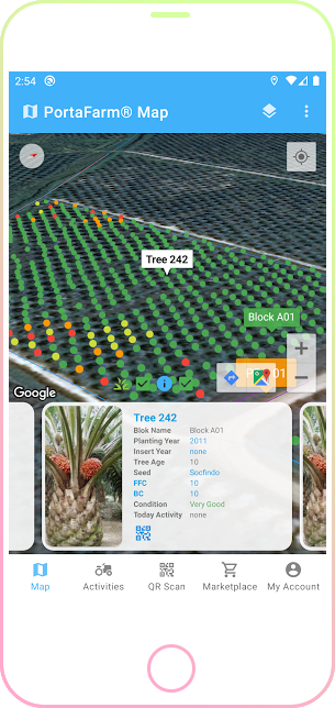 This technology allows each oil palm tree to have its own ID (QR Code) and can provide notifications to users. This technology also changes the management of oil palm plantations from a block approach to a tree approach, making it more precise and efficient.
